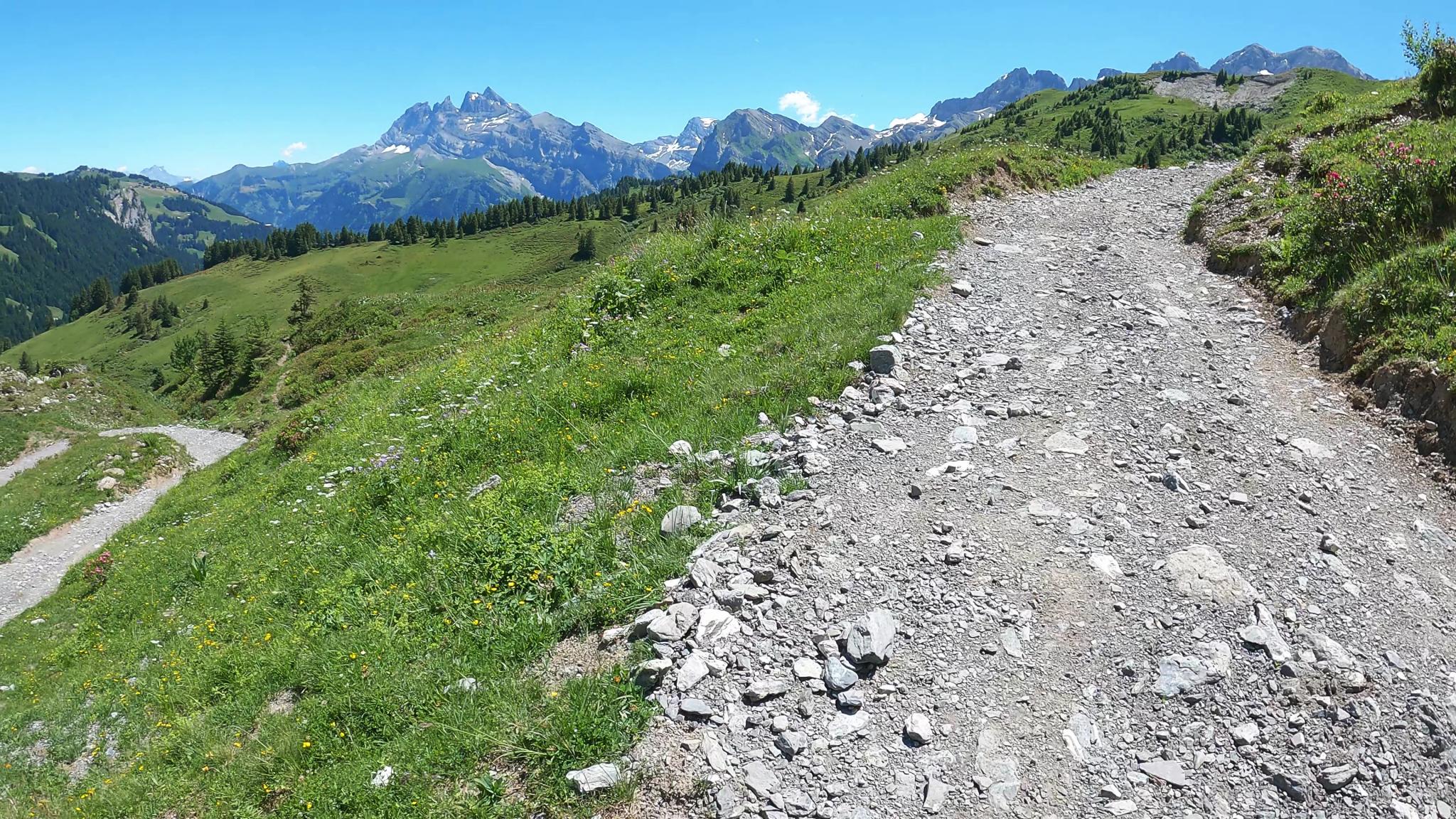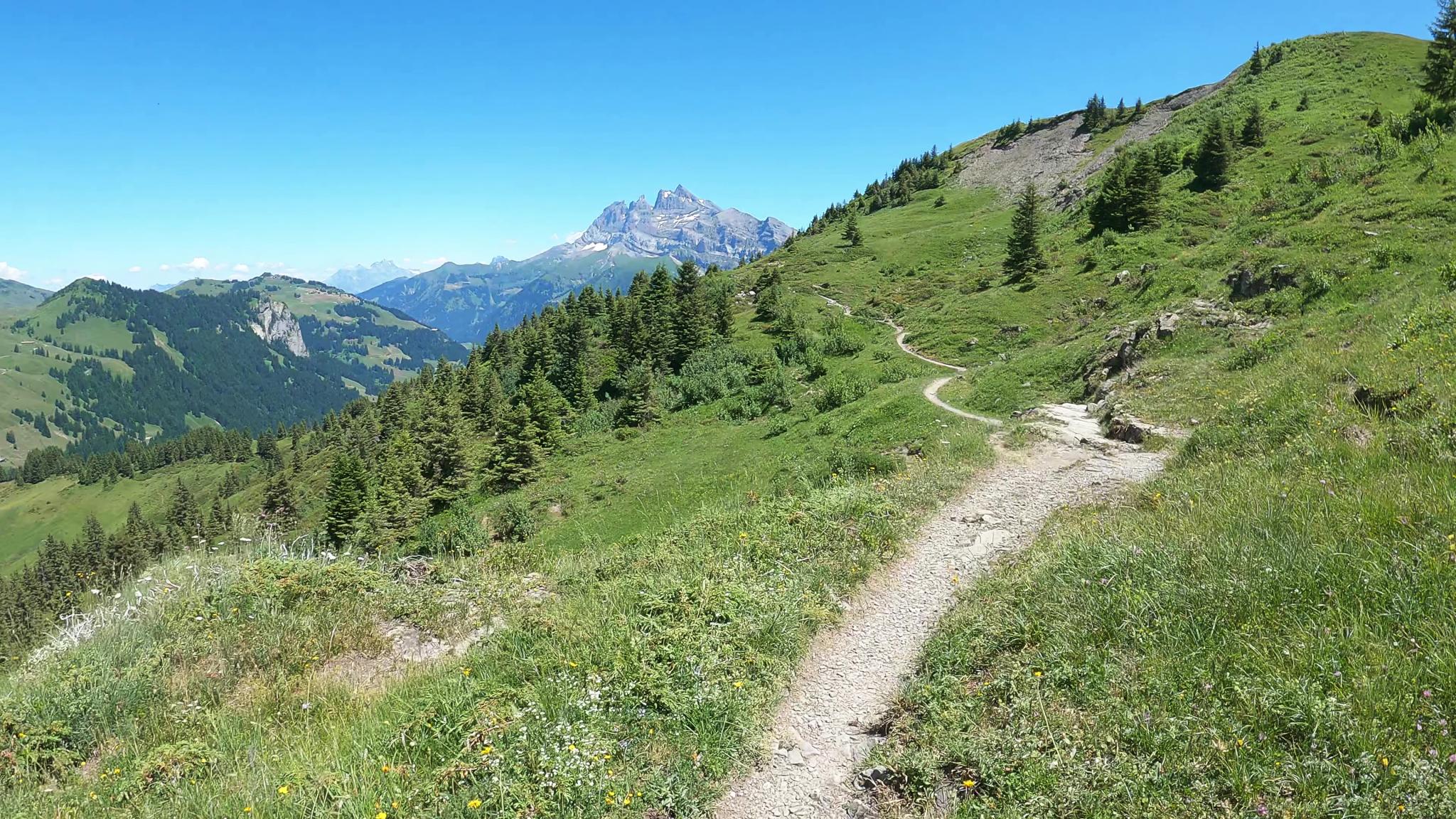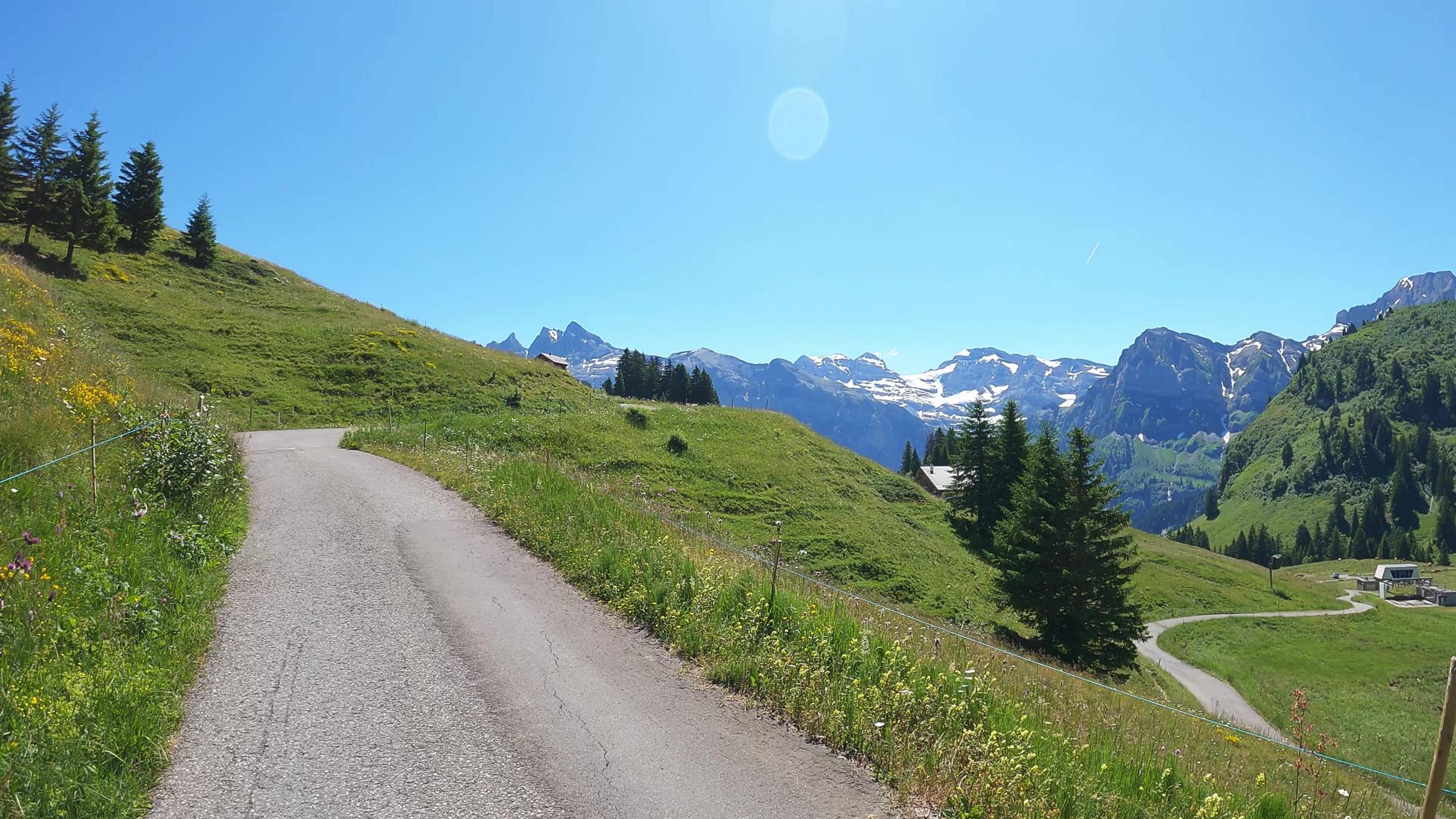 Montée depuis Champéry, on part vers le fond de la vallée pour rejoindre la petite route de Planachaux. On rejoint d'abord le replat de la Lécheureuse, puis les hauts des Crosets.